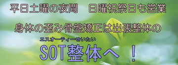 出張整体のSOT整体の出張地域は江戸川区、葛飾区、千葉県市川市です。平日土曜夜間と日曜は午後から深夜、祝祭日は朝から深夜の終日営業とし身体の歪み、骨盤矯正、肩こり、腰痛を中心として施術しております。